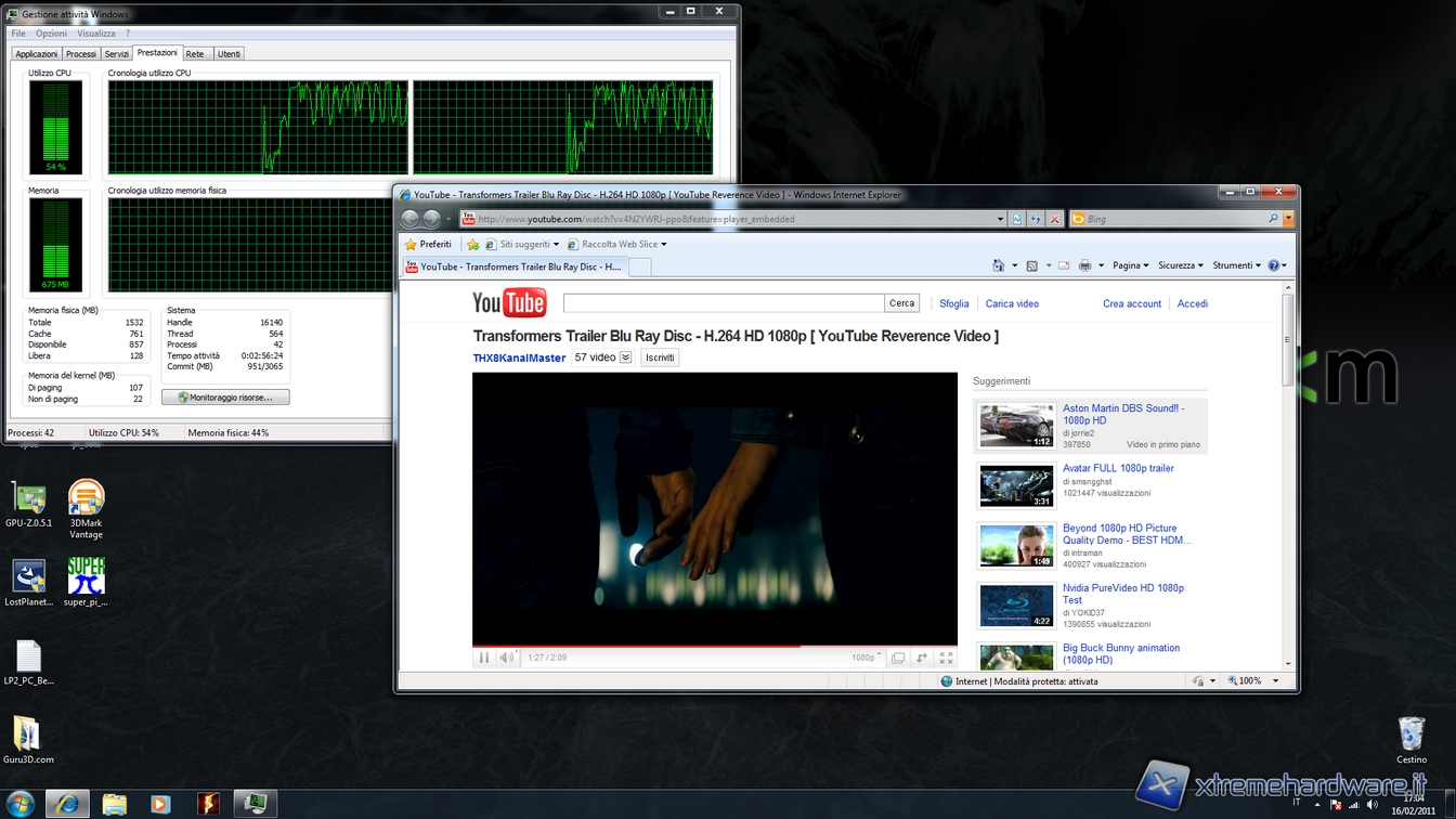 Abbiamo effettuato il primo test utilizzando Internet Explorer 8 e come si può vedere l’utilizzo della cpu si è risultato essere del 90/100% in alcuni casi, nonostante ciò non abbiamo riscontrato rallentamenti o blocchi durante l’esecuzione del filmato a tutto schermo.