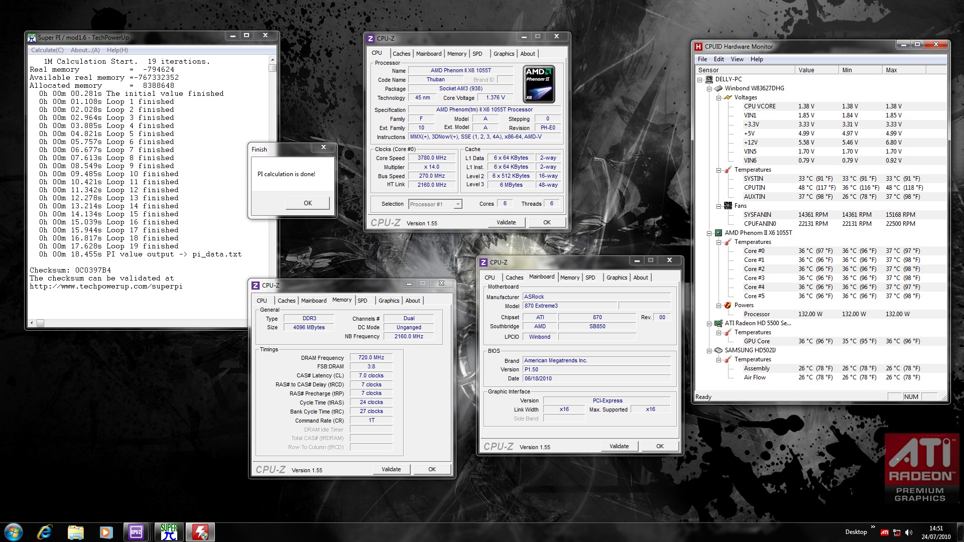 Sia la ASRock 870 Extreme3 che il Phenom II 1055T si sono dimostrati abbastanza tolleranti all’overclock. Senza problemi ci siamo spinti fino a circa 3.8GHz ad aria (OC 35% circa), impostando un bus di 270MHz. Per mantenere la stabilità è stato necessario applicare un vcore di 1.37v. In questa condizione siamo riusciti a chiudere tutti i bench sintetici, registrando un buon impatto sulle prestazioni generali del sistema. Le temperature sono aumentate di pochi gradi, comunque mantenendosi a livelli più che accettabili.